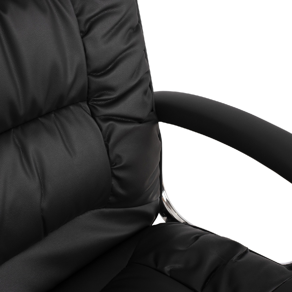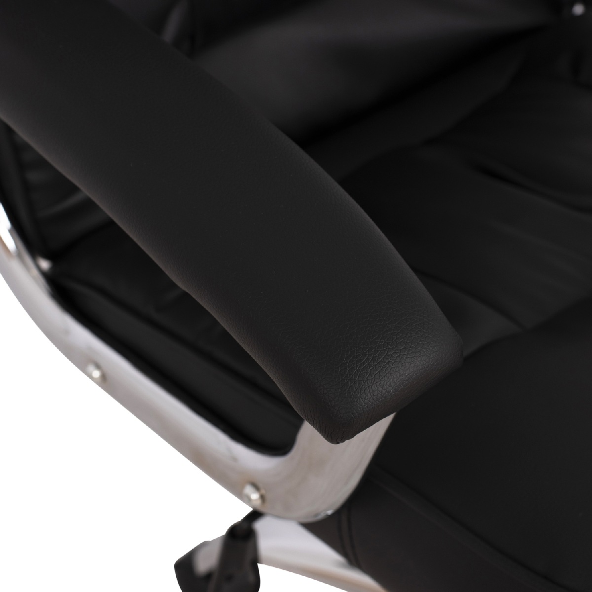 Διευθυντική καρέκλα γραφείου “REESE” σε μαύρο χρώμα. Μια «πλούσια» καρέκλα γραφείου με ψηλά μπράτσα με ελαφριά κλίση και επενδυμένα με μια στρώση αφρολέξ σε PU δέρμα. Η πλάτη είναι ψηλή με πλούσια στρώση από αφρώδη υλικά και έξτρα ενσωματωμένο μαξιλάρι για το κεφάλι για άνεση κατά την χρήση και υποστηρίζει ολόκληρο τον κορμό σας, ενώ είναι επενδυμένη με υψηλής ποιότητας PU δέρμα , όπως επίσης και το φαρδύ και αναπαυτικό κάθισμα με την αναπαυτική επιφάνεια. Η βάση είναι χρωμιωμένη σε σχήμα «αστέρι» με κυρτά πόδια και μαύρα ροδάκια.