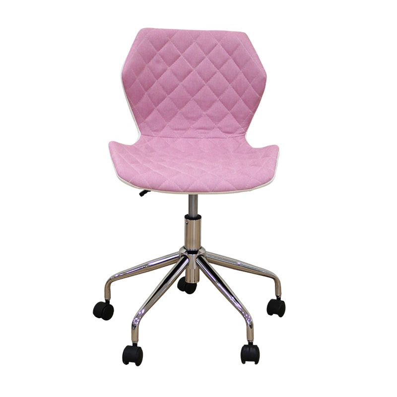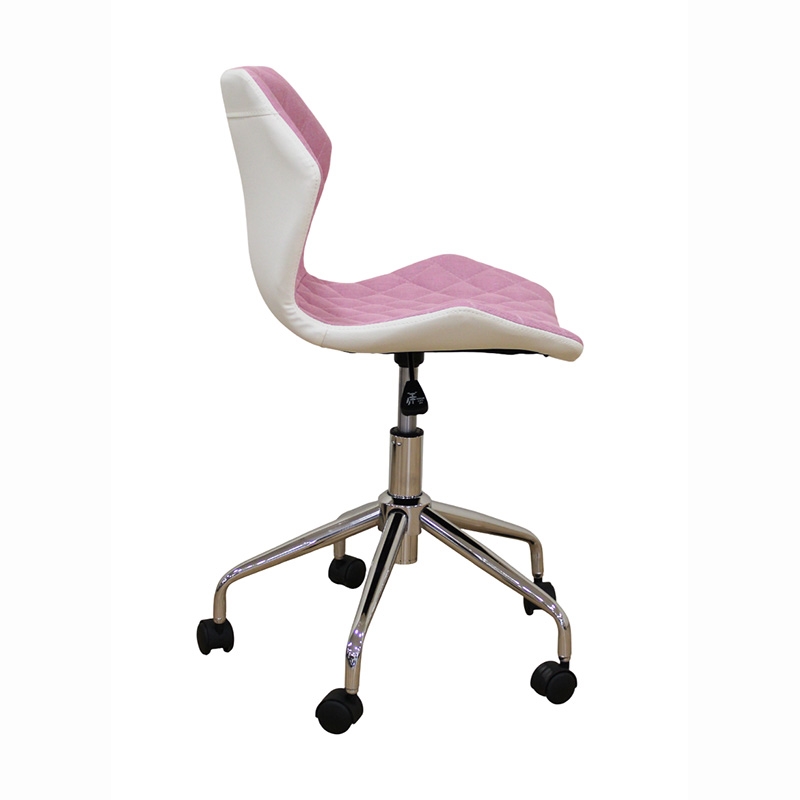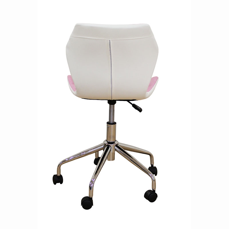 A1700 καρέκλα γραφείου με εντυπωσιακό design, επένδυση από ύφασμα καπιτονέ σε ροζ χρώμα και από την πίσω πλευρά του καθίσματος η πλάτη είναι σε λευκό PU. Το κάθισμα ρυθμίζεται στο επιθυμητό ύψος και κάνει πλήρη περιστροφή. Η ιδιαίτερη βάση και το αμορτισέρ του καθίσματος είναι μεταλλικά χρωμίου για μεγαλύτερη αντοχή.