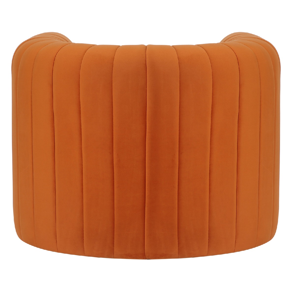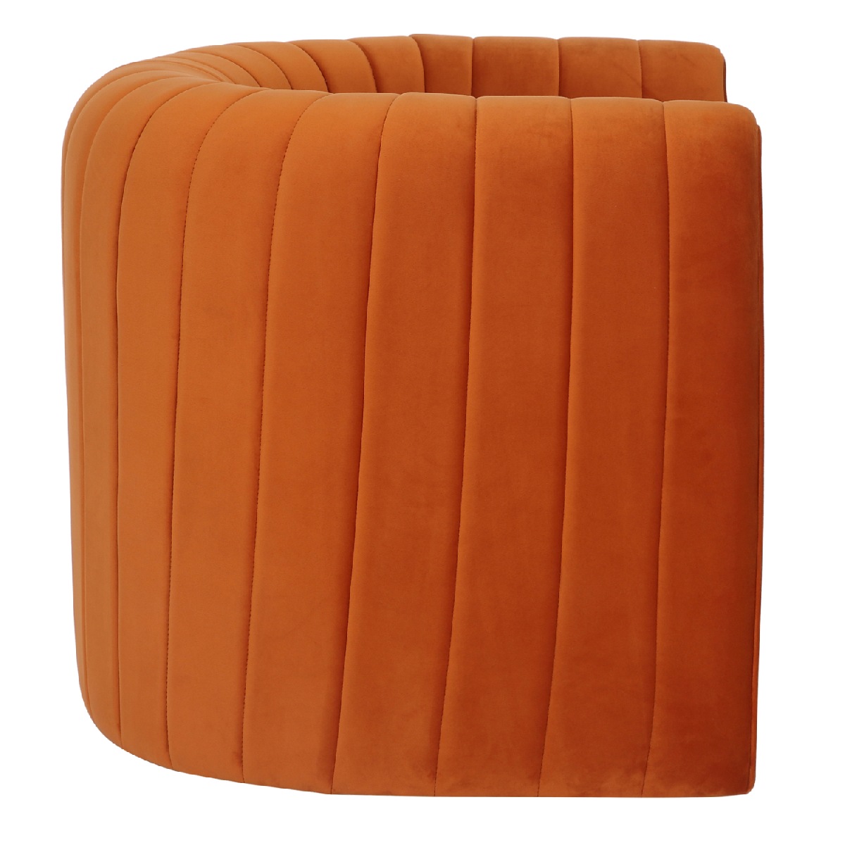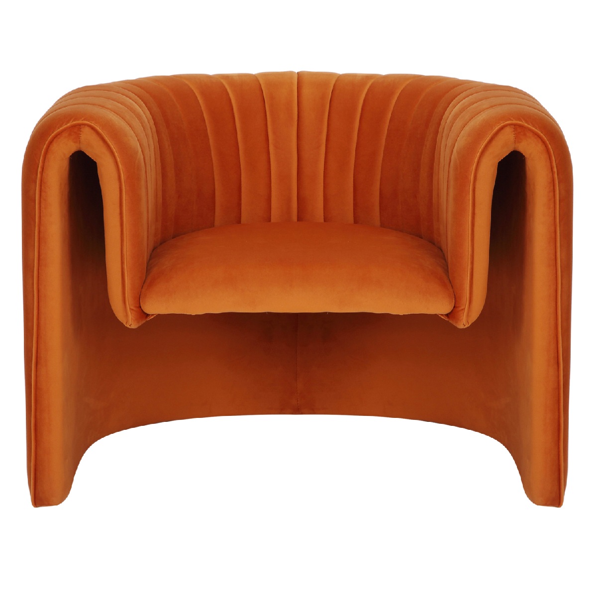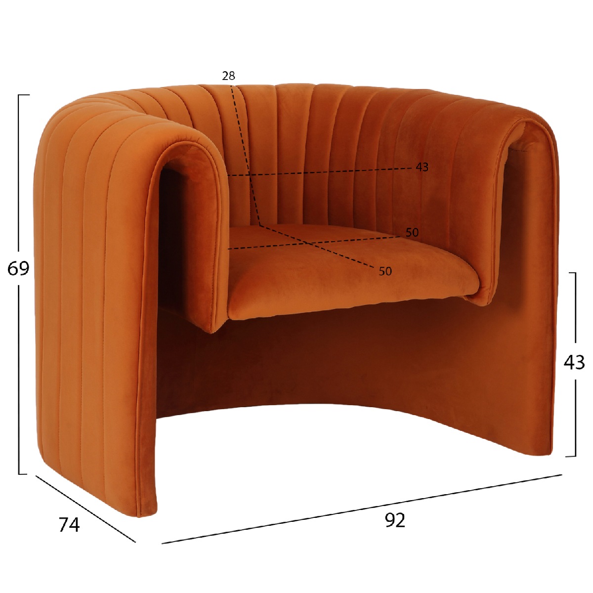Περιγραφή Η πολυθρόνα εσωτερικού χώρου RIKER σε ΠΟΡΤΟΚΑΛΙ χρώμα είναι μοντέρνα και πανέμορφη. Το χαρακτηριστικό που κάνει αυτή την πολυθρόνα να ξεχωρίζει είναι οι καμπύλες του μεταλλικού σκελετού που σχηματίζουν την ημικυκλική πλάτη με τα μπράτσα και όλη η κατασκευή φτάνει μέχρι κάτω δημιουργώντας ουσιαστικά και τα πόδια της πολυθρόνας ως φυσική συνέχεια του design. Μια πολυθρόνα με βελούδινη επένδυση που είναι σίγουρο ότι θα μαγνητίσει το ενδιαφέρον όλων.