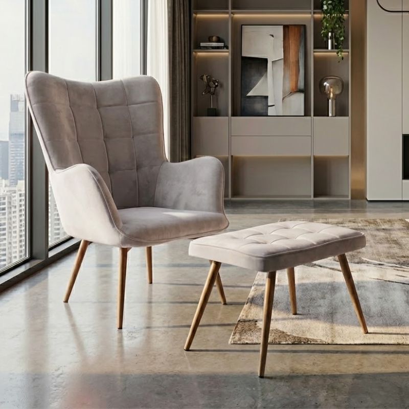 Η μπερζέρα με υποπόδιο Lily σε μπεζ βελούδο είναι ένα statement κομμάτι που φέρνει στο χώρο σας ζεστασιά, κομψότητα και απόλυτη άνεση. Η πλάτη τύπου “wingback” αγκαλιάζει το σώμα προσφέροντας εργονομική στήριξη, ενώ το απαλό βελούδινο ύφασμα αναδεικνύει το design και δημιουργεί αίσθηση πολυτέλειας. Οι καπιτονέ ραφές στην πλάτη και στο υποπόδιο ενισχύουν τον χαρακτήρα της πολυθρόνας και χαρίζουν μια διαχρονική, εκλεπτυσμένη εικόνα. Τα πόδια σε φυσική απόχρωση ξύλου, κατασκευασμένα από ανθεκτικό μέταλλο, προσφέρουν σταθερότητα και ολοκληρώνουν το κομψό σύνολο. Μια ιδανική επιλογή για σαλόνια, υπνοδωμάτια, ή ακόμα και κομψούς επαγγελματικούς χώρους, που θα τραβήξει σίγουρα τα βλέμματα και θα αναβαθμίσει την αισθητική κάθε περιβάλλοντος.