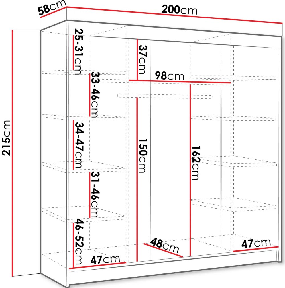 Ντουλάπα Derby VI συρόμενη, μοντέρνου σχεδιασμού, με πρακτικούς αποθηκευτικούς χώρους με ράγα για κρεμάστρες και ράφια για καλύτερη οργάνωση ρούχων και αντικειμένων.