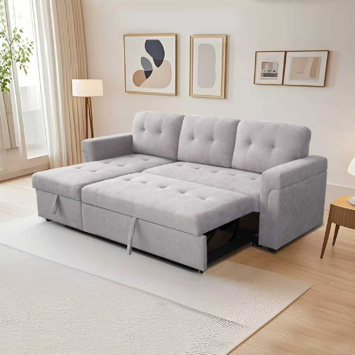 Ο SAL είναι ένας όμορφος και πρακτικός γωνιακός καναπές. Το χρώμα της επένδυσης ολόκληρου του καναπέ είναι ΑΝΟΙΧΤΟ ΓΚΡΙ. Εκτός από γωνιακός καναπές, γίνεται και κρεβάτι τραβώντας με δύο ιμάντες το έξτρα «ράντζο» που βρίσκεται κάτω από το κυρίως κάθισμα. Επίσης, ο καναπές μπορεί να στηθεί είτε με δεξιά γωνία, είτε με αριστερή (αναστρέψιμος) ενώ διαθέτει και αποθηκευτικό χώρο κάτω από το τμήμα της γωνίας. Τέλος, τα πόδια του καναπέ είναι χαμηλά δίνοντας στιβαρότητα σε όλη την κατασκευή.