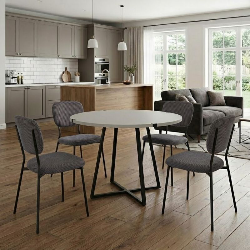 Σετ τραπεζαρία 5τμχ Rubes - Kevin Megapap χρώμα λευκό - γκρι Ø100x78εκ.Η τραπεζαρία Rubes - Kevin θα φέρει μία αίσθηση εκλεπτυσμένης κομψότητας στον χώρο σας. Το πλούσιο κοτλέ ύφασμα της καρέκλας χαρίζει ζεστασιά και υφή, ενώ τα μεταλλικά πόδια προσδίδουν μοντέρνο χαρακτήρα και σταθερότητα. Ιδανική επιλογή τόσο για το σπίτι όσο και για επαγγελματικούς χώρους που θέλουν να επικοινωνήσουν ποιότητα και design σε κάθε λεπτομέρεια.