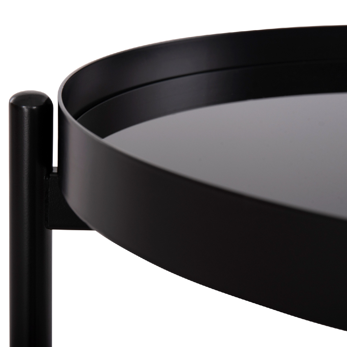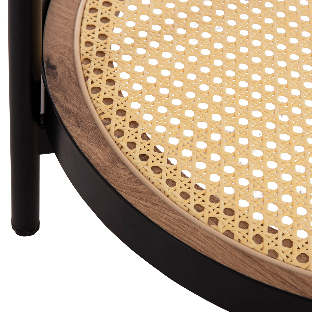 Το SEITZ είναι ένα όμορφο και σχετικά ψηλό στρογγυλό βοηθητικό τραπεζάκι. Το χαρακτηριστικό του είναι ότι διαθέτει 2 επιφάνειες οι οποίες στηρίζονται σε ΜΑΥΡΕΣ μεταλλικές χιαστί βάσεις. Η επάνω επιφάνεια είναι γυάλινη (γυαλί ασφαλείας) σε ΜΑΥΡΟ χρώμα, ενώ η κάτω επιφάνεια είναι κατασκευασμένη από Rattan σε πλέξη wicker σε ΦΥΣΙΚΟ χρώμα. Ένα μοναδικό τραπέζι που συνδυάζει πρακτικότητα και πολυτέλεια για τον χώρο σας.