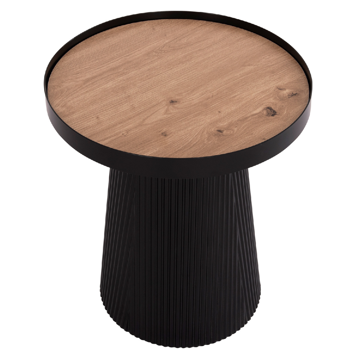 Το βοηθητικό τραπέζι DENTON είναι στρογγυλό και σχετικά ψηλό, σε χρώμα ΜΑΥΡΟ. Η επιφάνειά του είναι από MDF σε χρωματισμό ΦΥΣΙΚΟΥ ΞΥΛΟΥ μονταρισμένη σε έναν μεταλλικό δίσκο με υπερυψωμένη περίμετρο, ενώ η βάση του είναι κωνική κατασκευασμένη εξολοκλήρου από MDF, με όμορφες πτυχώσεις. Ιδανικό για πληθώρα χώρων χάρη στην πρακτικότητά του.
