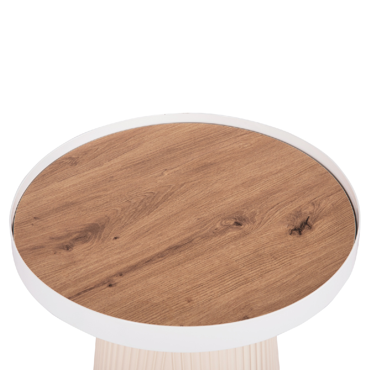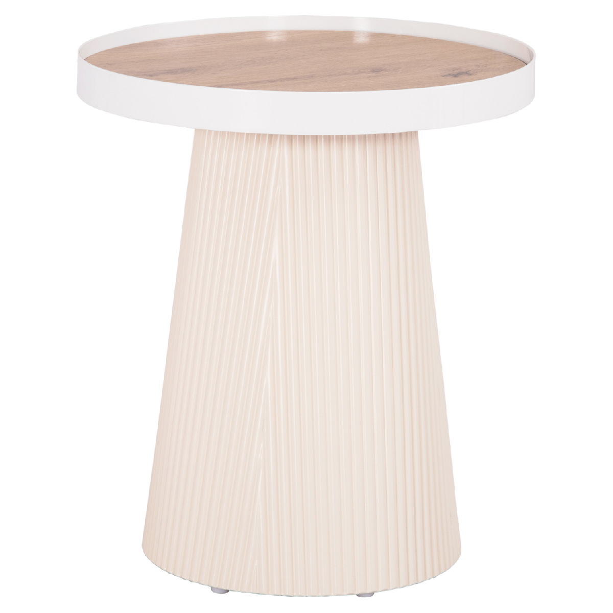 Το βοηθητικό τραπέζι DENTON είναι στρογγυλό και σχετικά ψηλό, σε χρώμα ΛΕΥΚΟ. Η επιφάνειά του είναι από MDF σε χρωματισμό ΦΥΣΙΚΟΥ ΞΥΛΟΥ μονταρισμένη σε έναν μεταλλικό δίσκο με υπερυψωμένη περίμετρο, ενώ η βάση του είναι κωνική κατασκευασμένη εξολοκλήρου από MDF, με όμορφες πτυχώσεις. Ιδανικό για πληθώρα χώρων χάρη στην πρακτικότητά του.