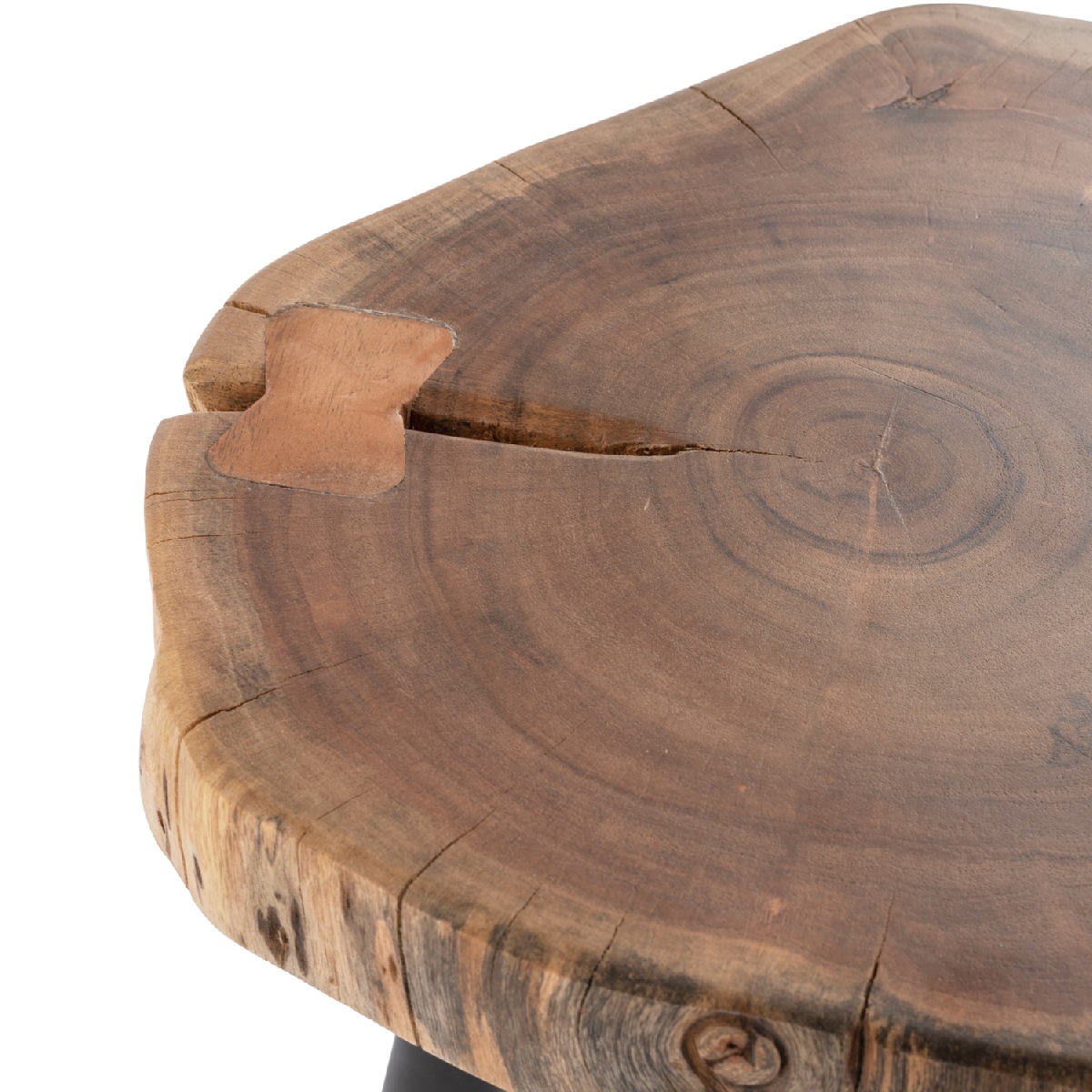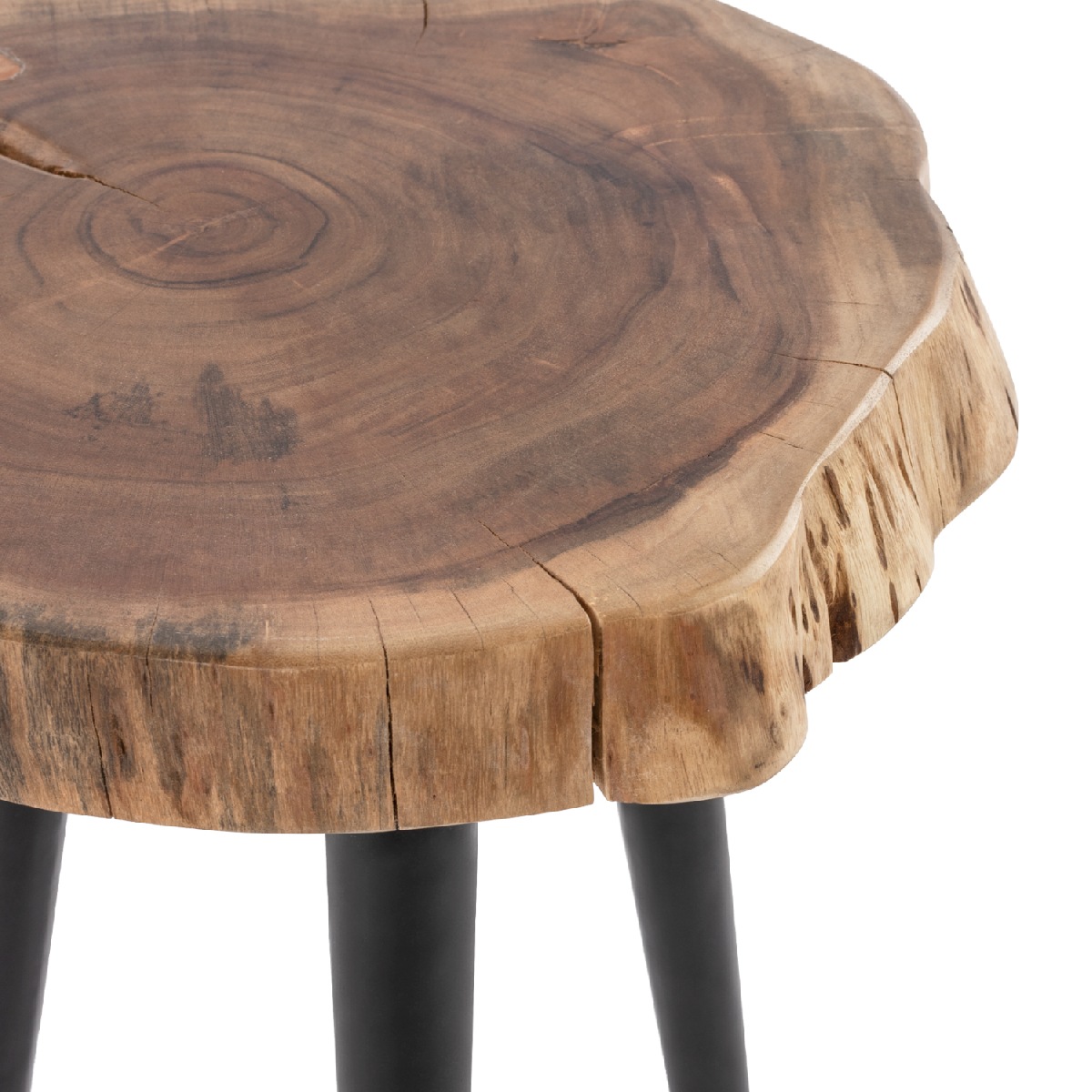 Χειροποίητο τραπέζι σε ακανόνιστο σχήμα επιφάνειας με 3 μαύρα μεταλλικά πόδια σε διάταξη που «ανοίγουν» προς τα κάτω.