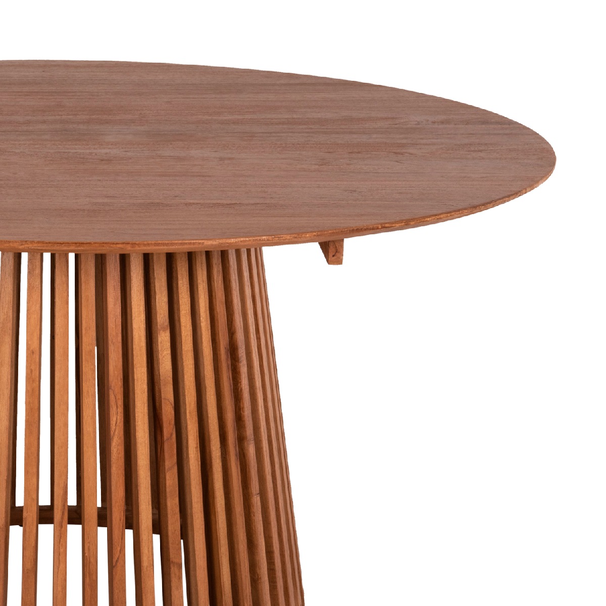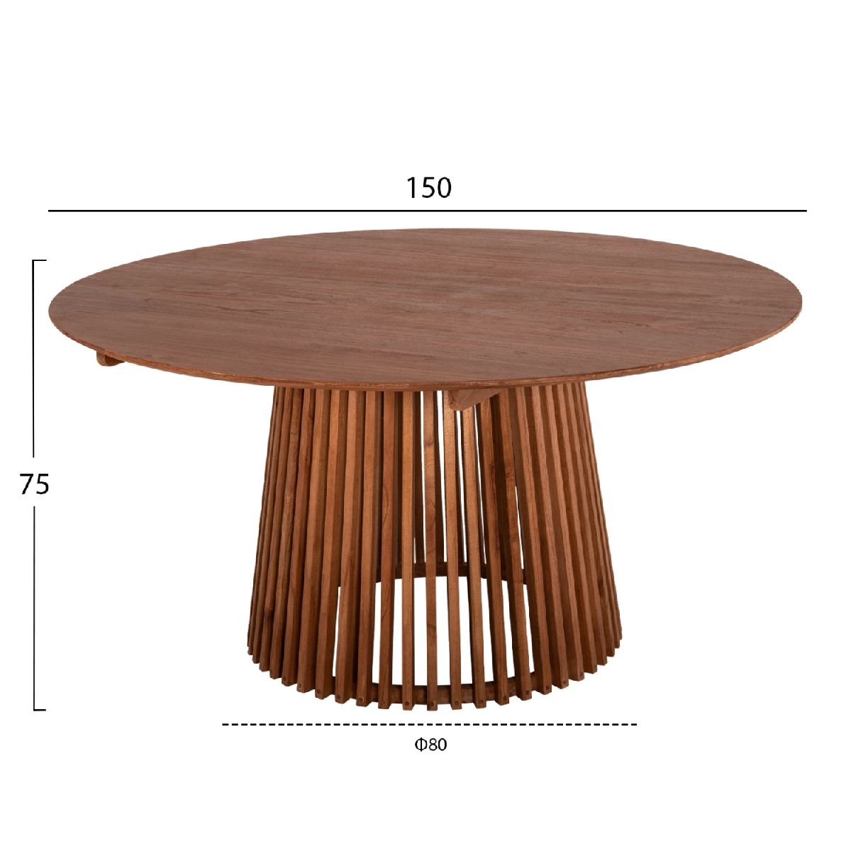 Το FRANTZ είναι ένα στρογγυλό τραπέζι σε μεγάλες διαστάσεις σε φυσικό χρώμα ξύλου. Το τραπέζι στηρίζεται σε μια ξύλινη κατασκευή στο κέντρο με πολλές δοκούς σε κυκλική διάταξη που ενώνονται μεταξύ τους με δακτυλίους στην εσωτερική πλευρά. Αυτό το τραπέζι θα αναβαθμίσει αισθητικά την τραπεζαρία σας ενώ μπορεί να ταιριάξει με πολλά διαφορετικά στυλ και χρώματα στον τριγύρω χώρο, όπως και με διαφορετικά στυλ καρέκλας.
