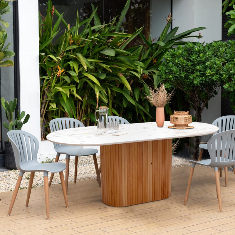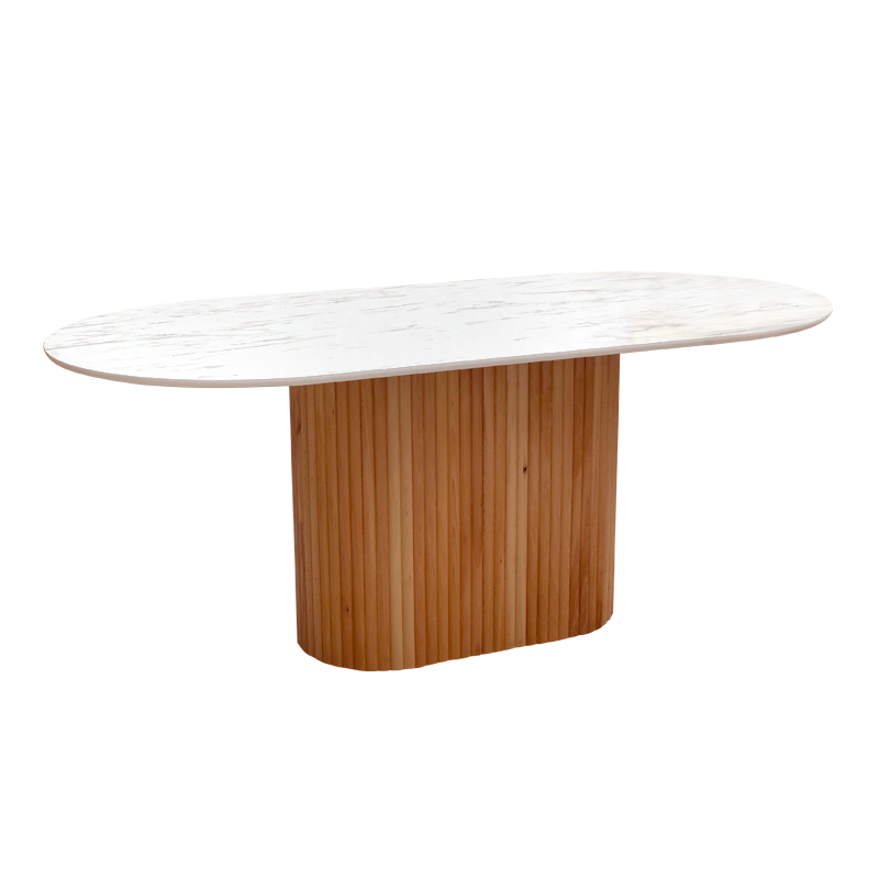 - Το τραπέζι στηρίζεται σε μια ξύλινη κατασκευή στο κέντρο με πολλές δοκούς σε οβάλ διάταξη.