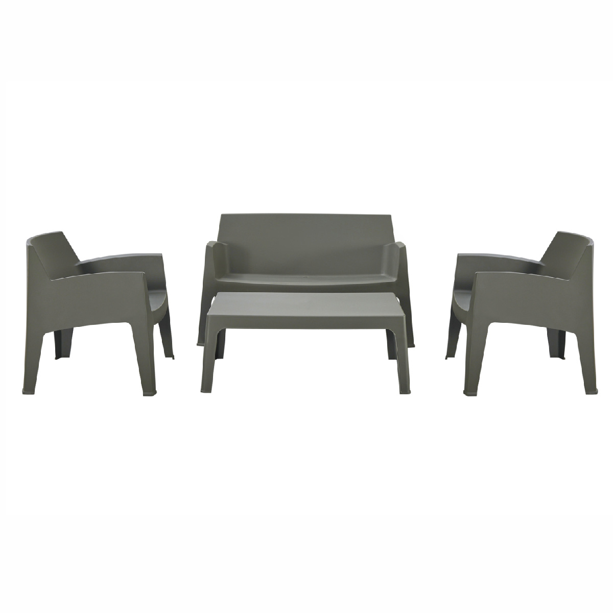 Ένα ορθογώνιο τραπεζάκι, 2 στοιβαζόμενες πολυθρόνες κι έναν 2-θέσιο καναπέ, τα οποία είναι εξολοκλήρου κατασκευασμένα από πολυπροπυλένιο σε DARK OLIVE GREEN χρώμα. Σχεδιαστικά, είναι λιτό και μπορεί να χρησιμοποιηθεί με πολλούς τρόπους προσφέροντας πρακτική και ανθεκτική χρήση. Ιδανική πρόταση για χρήση σε εξωτερικούς χώρους, είτε επαγγελματικούς (χώροι δεξιώσεων, εταιρείες catering, κλπ.) είτε για το σπίτι.