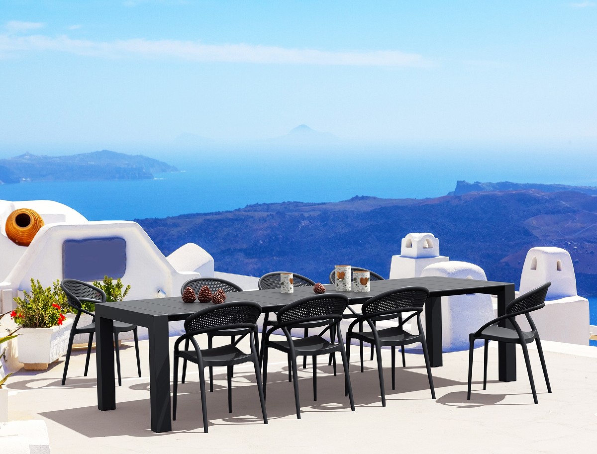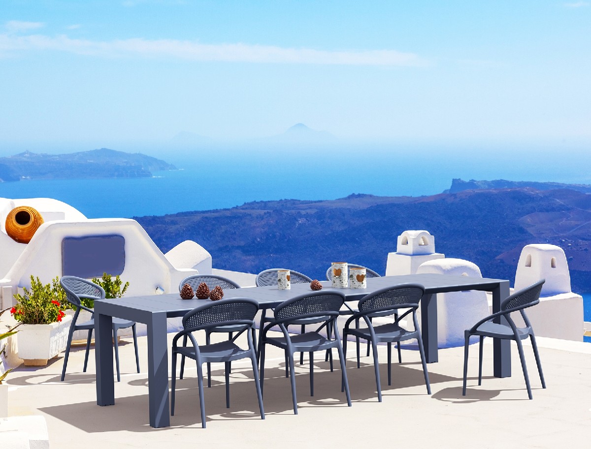 Set vegas τραπέζι 100X260/300 με 8 καρέκλες Sunset σε χρώμα dark grey του οίκου Siesta. Κατασκευασμένα από πολυπροπυλένιο για απόλυτη αντοχή. Ένα set με ιδιαίτερο desing και άριστη κομψότητα ιδανικό για επαγγελματική και για οικιακή χρήση. Κατάλληλο για εσωτερικό και εξωτερικό χώρο. Διατίθεται σε χρώματα white, taupe, dark grey και black.