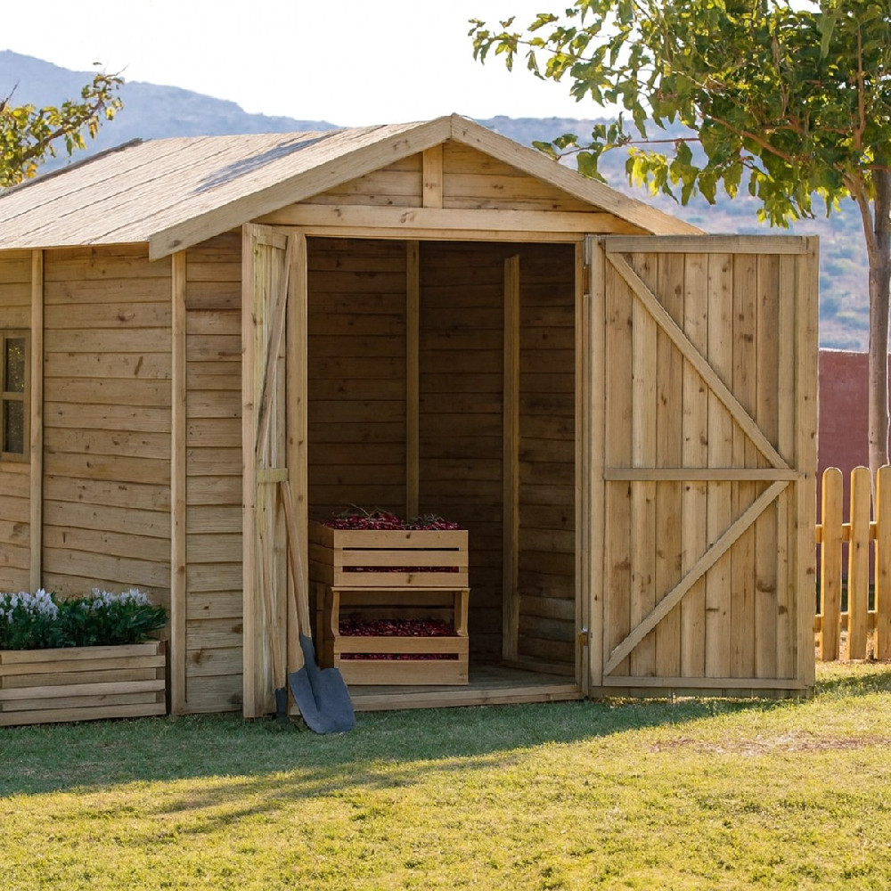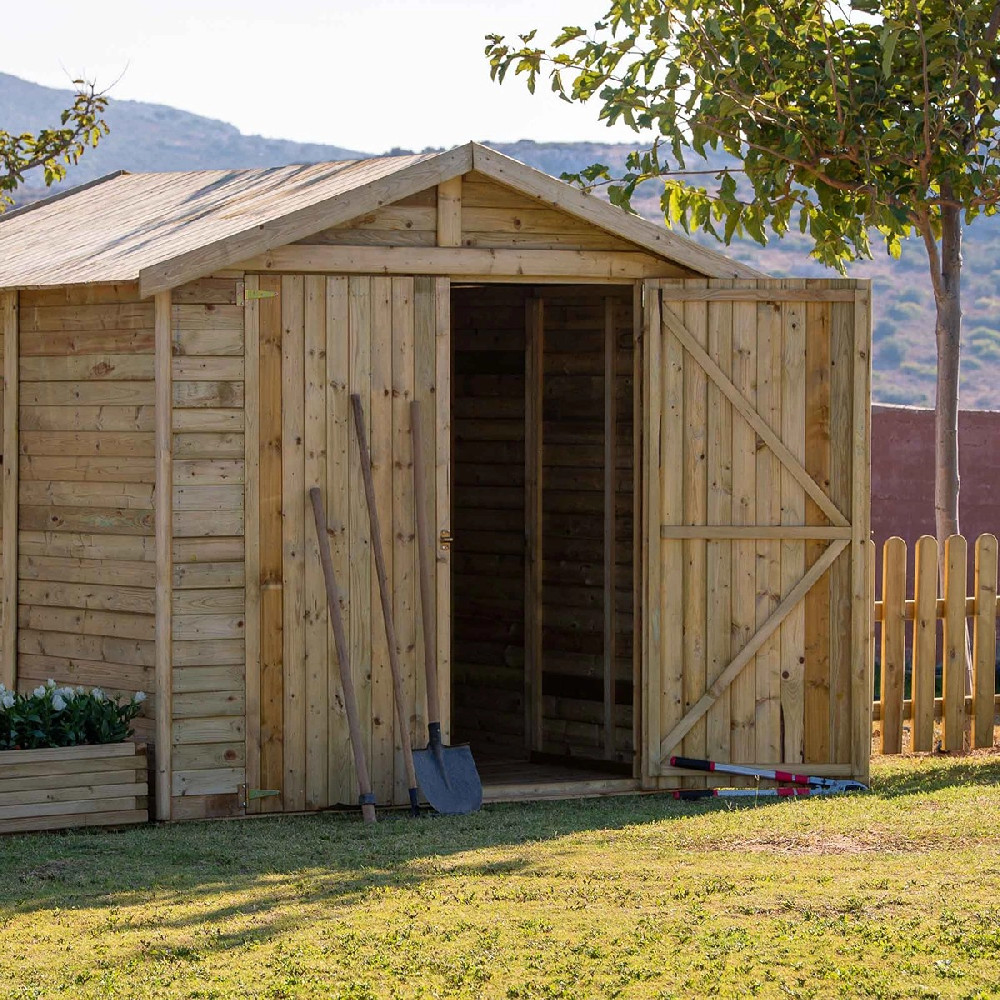 Το ξύλινο σπιτάκι – αποθήκη κήπου της με διαστάσεις 225 × 225 εκ. και επιφάνεια 5,06 m² αποτελεί μια στιβαρή και πρακτική λύση για κάθε εξωτερικό χώρο. Η κατασκευή του από εμποτισμένη πεύκη Βόρειας Ευρώπης εξασφαλίζει ανθεκτικότητα σε υγρασία, ήλιο και φθορές, ενώ το παράθυρο πολυκαρμπονικού υλικού (55 × 55 εκ.) προσφέρει φυσικό φωτισμό.