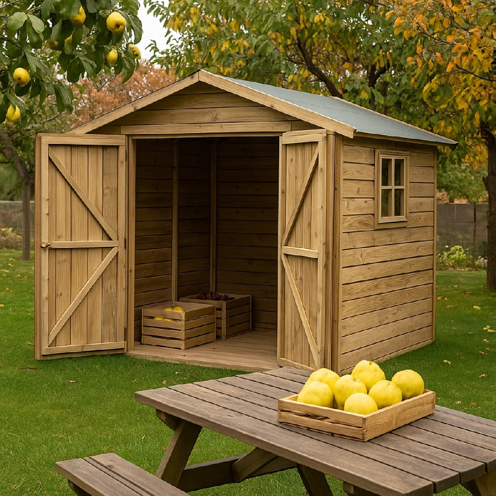 Το ξύλινο σπιτάκι – αποθήκη κήπου της με διαστάσεις 300 × 240 εκ. και συνολική επιφάνεια 7,20 m² προσφέρει έναν εξαιρετικά ευρύχωρο χώρο που καλύπτει όλες τις ανάγκες αποθήκευσης και αναψυχής.