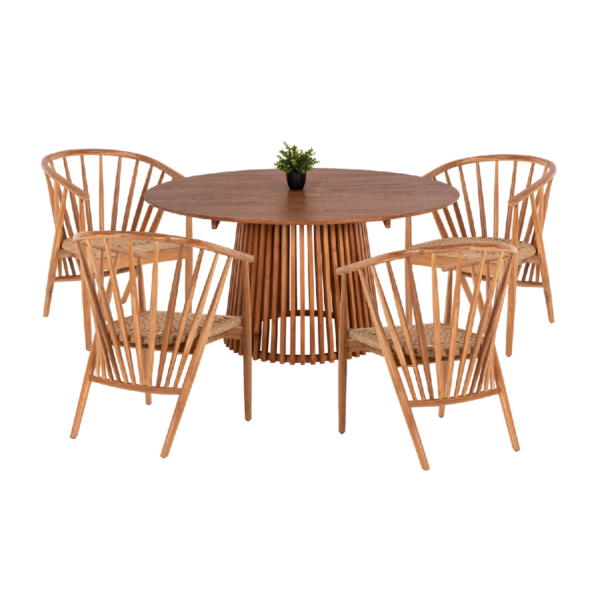 Περιγραφή Αυτό το σετ τραπεζαρίας εσωτερικού χώρου 5τμχ αποτελείται από ένα μεγάλο στρογγυλό τραπέζι FRANTZ κατασκευασμένο εξολοκλήρου από ξύλο MINDI σε ΦΥΣΙΚΟ χρώμα, και από 4 καρέκλες τραπεζαρίας PERMAINE κατασκευασμένες εξολοκλήρου από ξύλο teak με κάθισμα από P.E. σχοινί, σε χρώμα ΦΥΣΙΚΟ ξύλου.