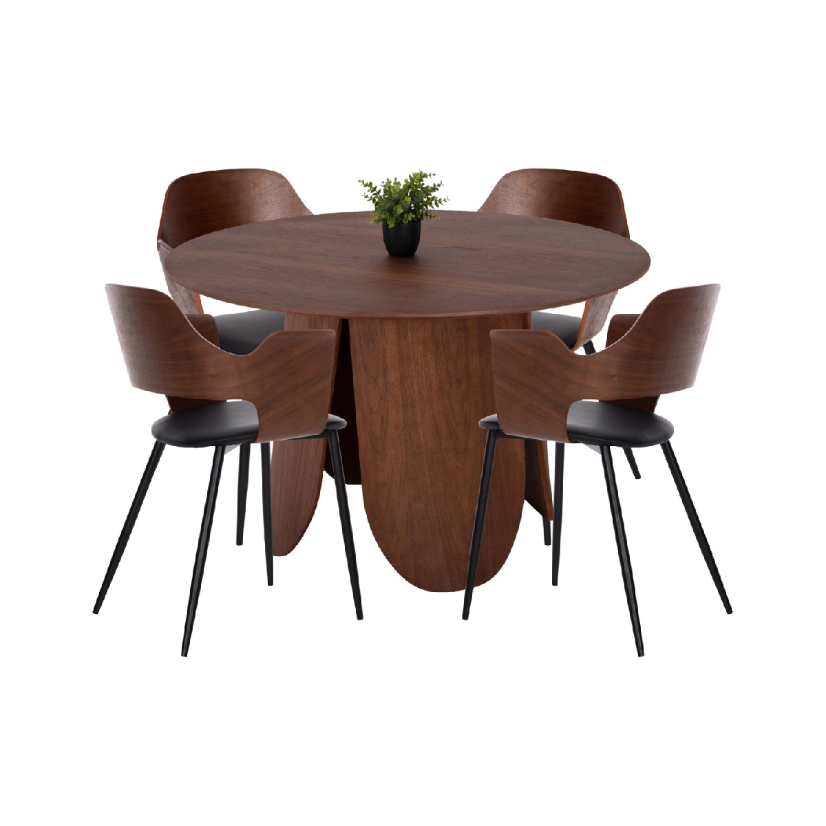 Περιγραφή Αυτό το σετ τραπεζαρίας εσωτερικού χώρου αποτελείται από ένα τραπέζι DENTY και 4 καρέκλες VELP. Το DENTY είναι ένα στρογγυλό τραπέζι για την τραπεζαρία, με φαλτσοκομμένη επιφάνεια από MDF με καπλαμά δρυός σε ΚΑΡΥΔΙ χρώμα. Η επιφάνεια αυτή στηρίζεται σε μία πανέμορφη ξύλινη κυλινδρική βάση με ίδιο χρωματισμό. Οι καρέκλες VELP έχουν κάθισμα σε ΜΑΥΡΗ απόχρωση και ΜΑΥΡΑ μεταλλικά πόδια. Αυτό, όμως, που ξεχωρίζει είναι ότι ολόκληρη η πλάτη είναι ξύλινη σε ΚΑΡΥΔΙ χρώμα κι είναι κυρτή και αναπαυτική.
