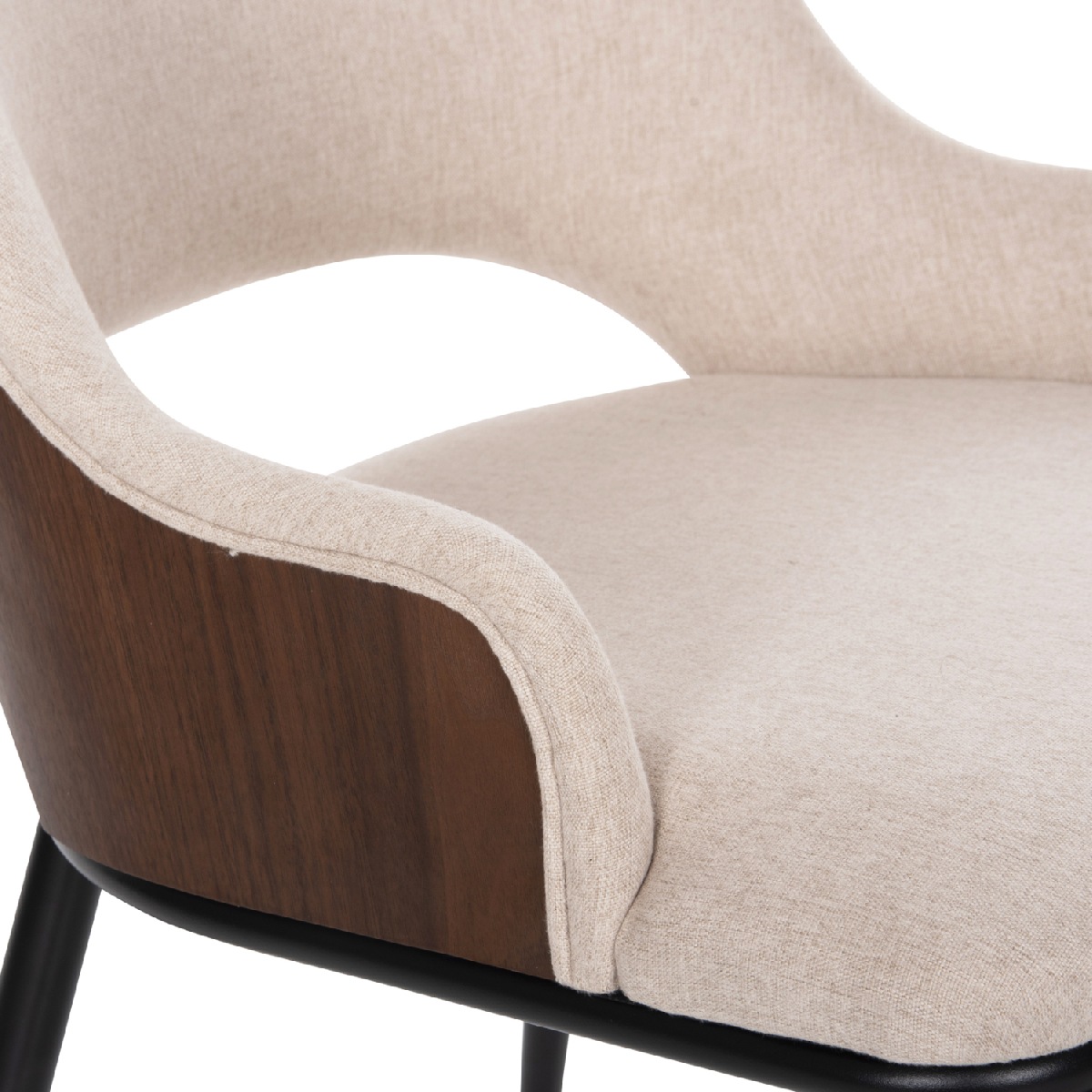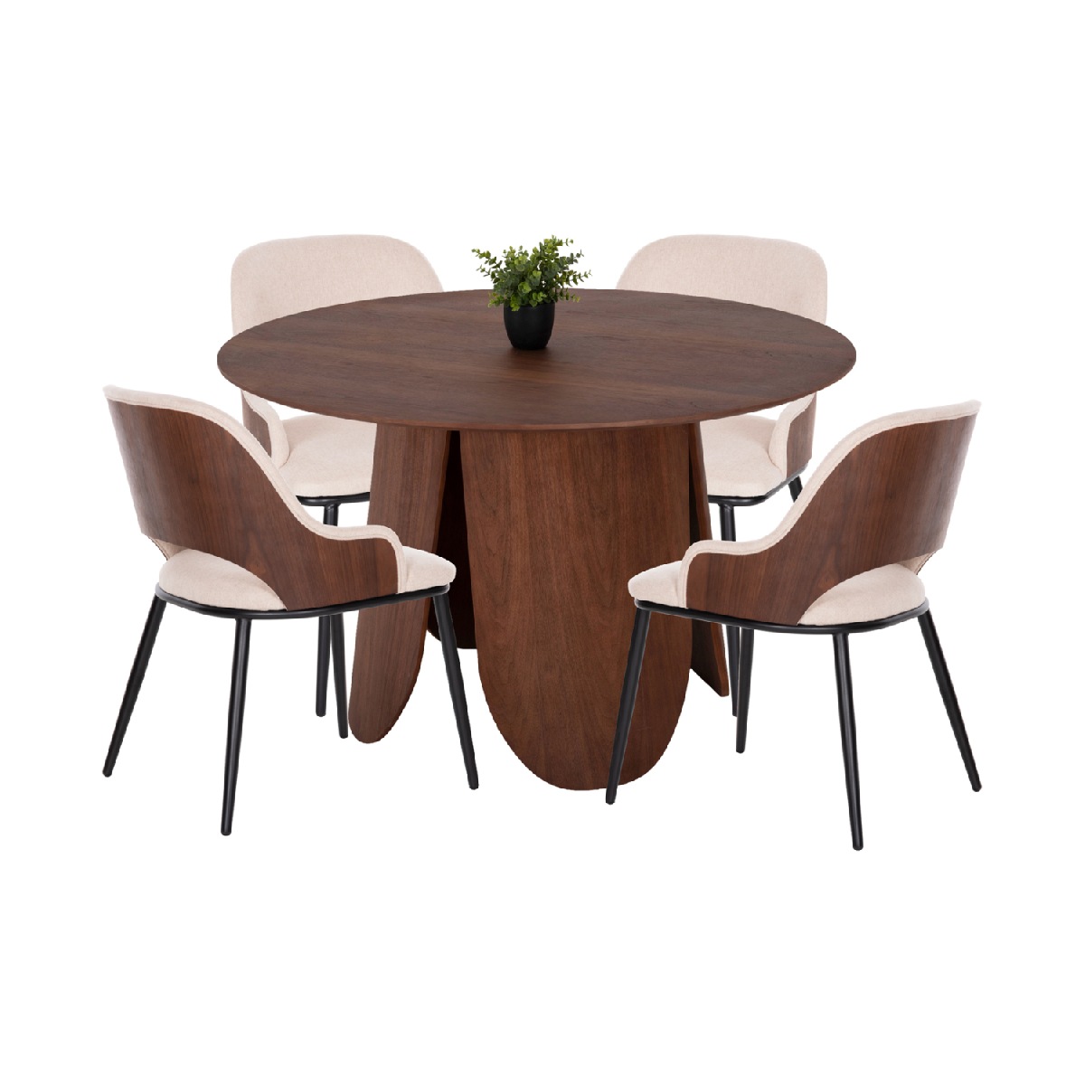 Περιγραφή Αυτό το σετ τραπεζαρίας εσωτερικού χώρου αποτελείται από ένα τραπέζι DENTY και 4 καρέκλες DELF. Το DENTY είναι ένα στρογγυλό τραπέζι για την τραπεζαρία, με φαλτσοκομμένη επιφάνεια από MDF με καπλαμά δρυός σε ΚΑΡΥΔΙ χρώμα. Η επιφάνεια αυτή στηρίζεται σε μία πανέμορφη ξύλινη κυλινδρική βάση με ίδιο χρωματισμό. Οι καρέκλες DELF έχουν επένδυση με ύφασμα σε ΜΠΕΖ απόχρωση και ΜΑΥΡΑ μεταλλικά πόδια. Αυτό, όμως, που ξεχωρίζει είναι ότι ολόκληρη η πλάτη είναι ξύλινη σε ΚΑΡΥΔΙ χρώμα κι είναι κυρτή και αναπαυτική.