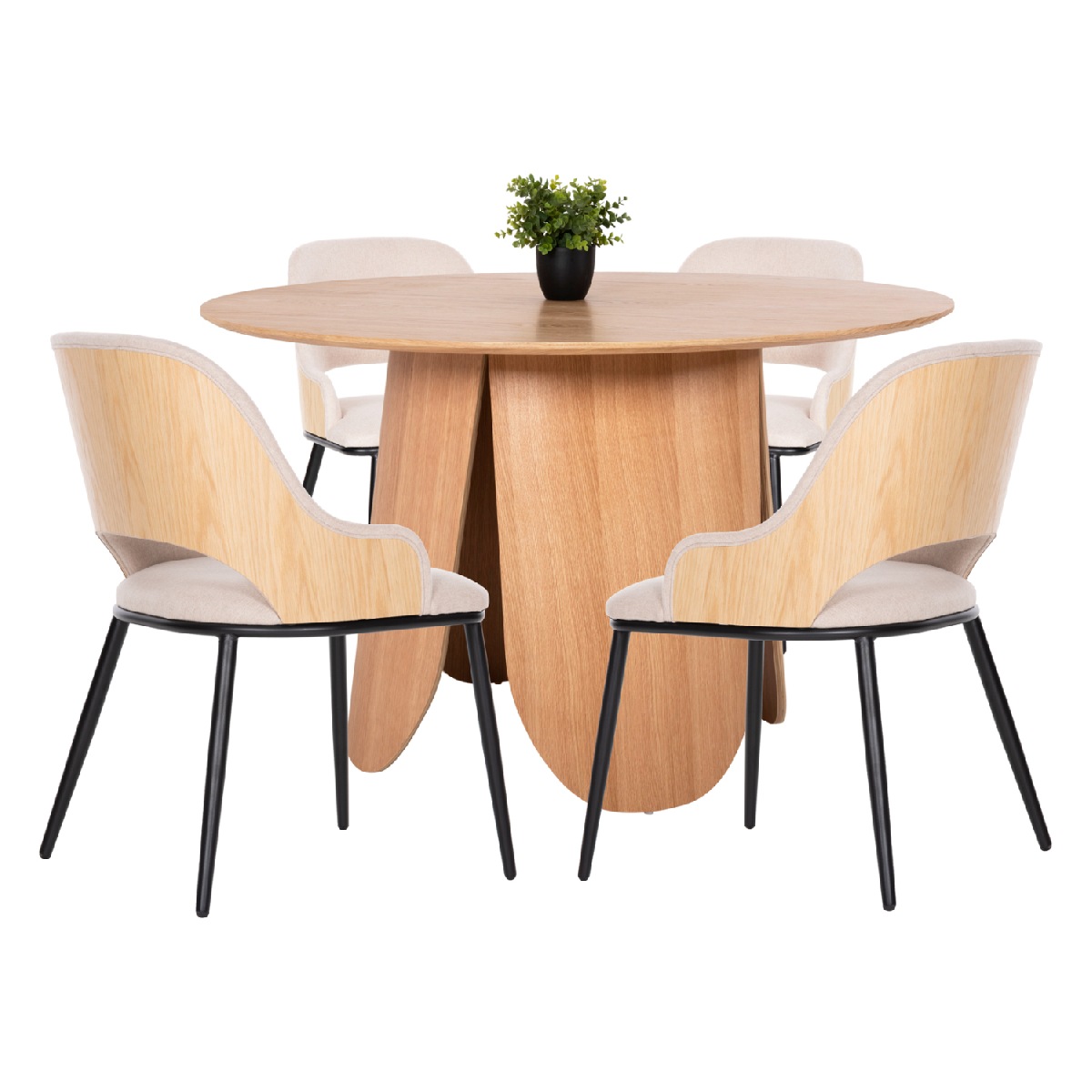 Αυτό το σετ τραπεζαρίας εσωτερικού χώρου αποτελείται από ένα τραπέζι DENTY και 4 καρέκλες DELF. Το DENTY είναι ένα στρογγυλό τραπέζι για την τραπεζαρία, με φαλτσοκομμένη επιφάνεια από MDF με καπλαμά δρυός σε ΦΥΣΙΚΟ χρώμα ΔΡΥΟΣ. Η επιφάνεια αυτή στηρίζεται σε μία πανέμορφη ξύλινη κυλινδρική βάση με ίδιο χρωματισμό. Οι καρέκλες DELF έχουν επένδυση με ύφασμα σε ΜΠΕΖ απόχρωση και ΜΑΥΡΑ μεταλλικά πόδια. Αυτό, όμως, που ξεχωρίζει είναι ότι ολόκληρη η πλάτη είναι ξύλινη σε χρώμα ΔΡΥΟΣ (OAK) κι είναι κυρτή και αναπαυτική.